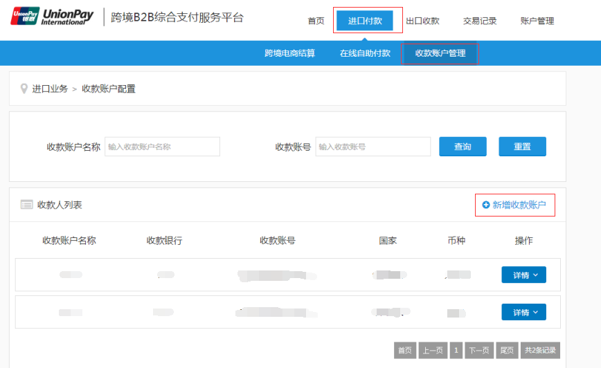 登陆企业账户,进入进口业务-收款账户配置页面,点击新增收款账户。