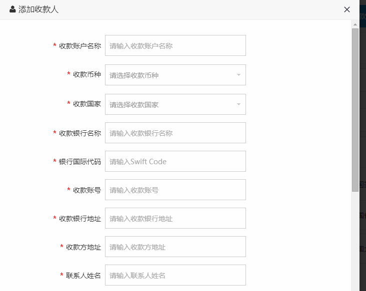 填写收款方姓名、币种、收款国家、银行名称、收款账号等信息,提交完成收款账户添加。