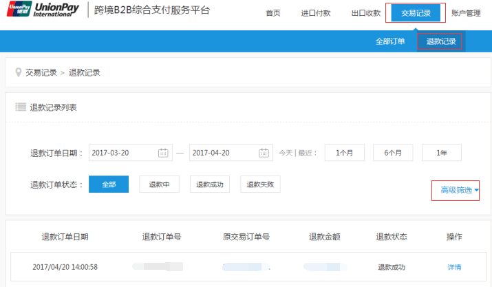 登陆企业账户,进入交易记录-退款记录栏目,则会为企业展示近期的退款记录,也可以通过订单筛选条件查询退款记录。